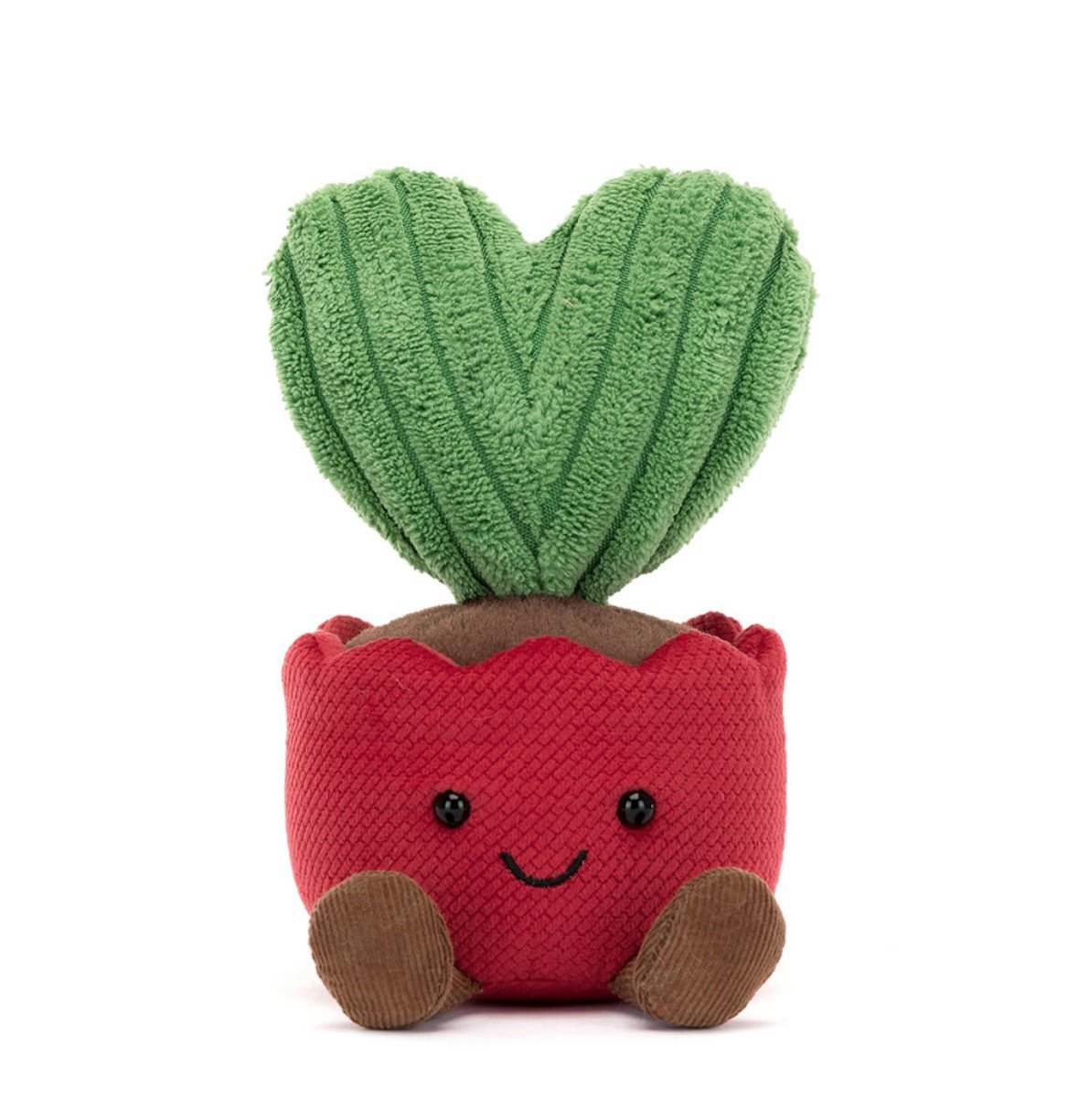 Amusable Kerril Cactus is the luckiest of lucky hearts. A green, cordy heart-shaped leaf is nestled in textured brown soil. A smiling red pot with a scallop trim, and cocoa cordy