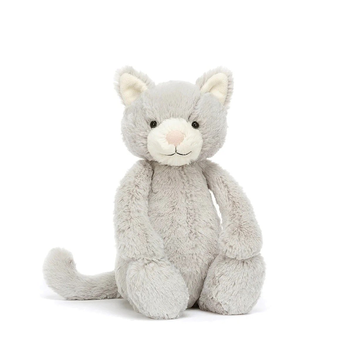 So soft and ever so pretty, Bashful Grey Kitty is a brilliant companion. This dreamy cat has cloud-soft pale grey fur, with cream paws and muzzle. With a sweet, stitched smile and long curved tail, this kitty has a sugar pink nose perfect for boops.
