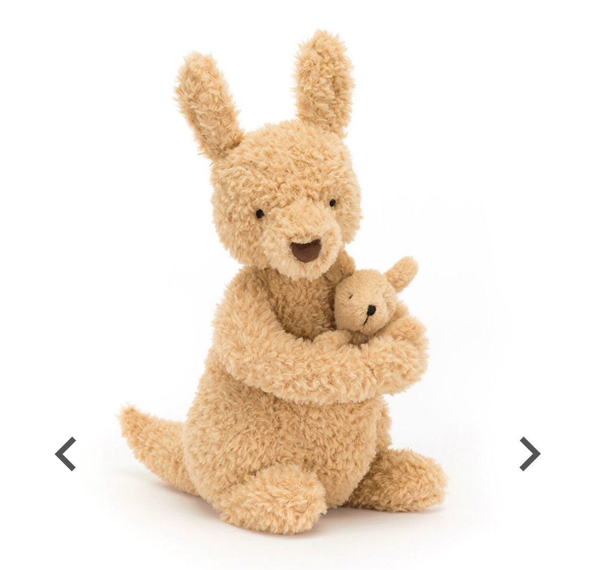 Huddles Kangaroo has brought her baby to meet you! This fleecy oatmeal kangaroo hugs the tiny joey in her pouch. Baby can hop out for a bounce about, or snuggle down for a rest. Mama has a black fur nose and her little one has a stitch nose instead, but both have adorable leaf-fold ears