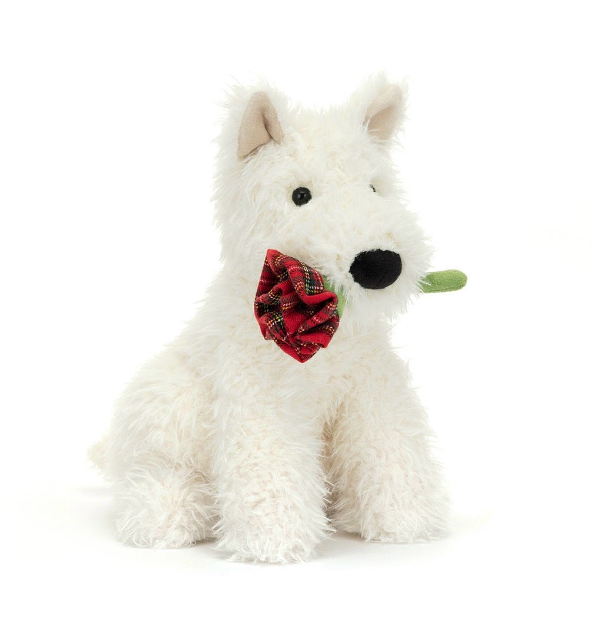 Munro Scottie Dog has a special delivery! Our shaggy cream pup has a black suedette nose, and is holding on tight to a red tartan rose, with a soft green stem. Munro promises to love you until the last petal falls!